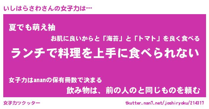 | 恥ずかしいあだ名 | 『プリティーいしはらさわ』『いしっちょ』 |