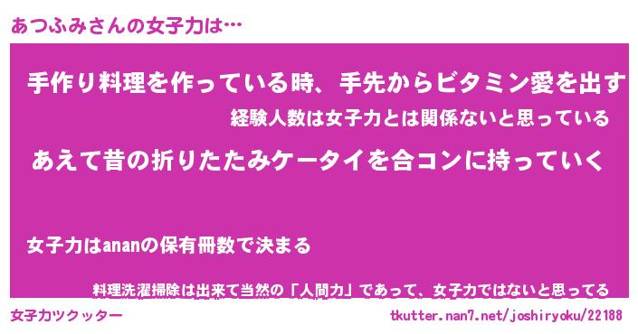 | ヘコむあだ名 | 『あつっふぃ~』『つくし』 |