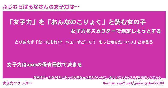 | 恥ずかしいあだ名 | 『プリティーふじわらはるな』『ふじちん』 |