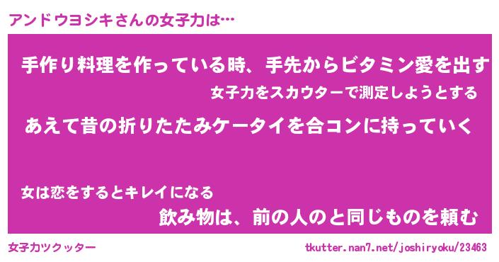 | 女子向けラノベタイトル風あだ名 | 『(仮)アンドウヨシキのやんごとなき事情』 |