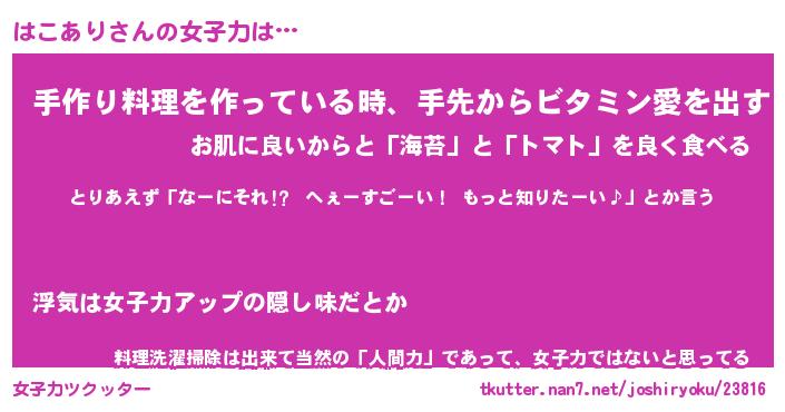 | ヘコむあだ名 | 『はこふぇ~』『つくし』『はこっ子』 |