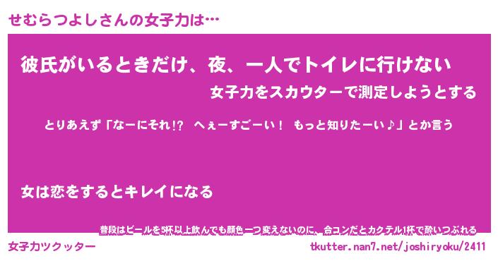 | ヘコむあだ名 | 『せむにゅー』『つくし』『せむを』 |