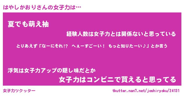 | 恥ずかしいあだ名 | 『プリティーはやしかおり』『はやっちょ』 |