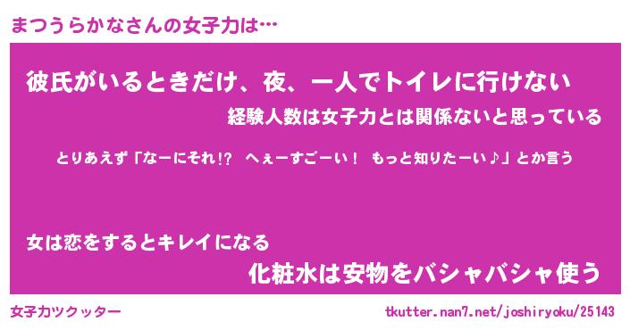 | 恥ずかしいあだ名 | 『プリティーまつうらかな』『まつっちょ』 |