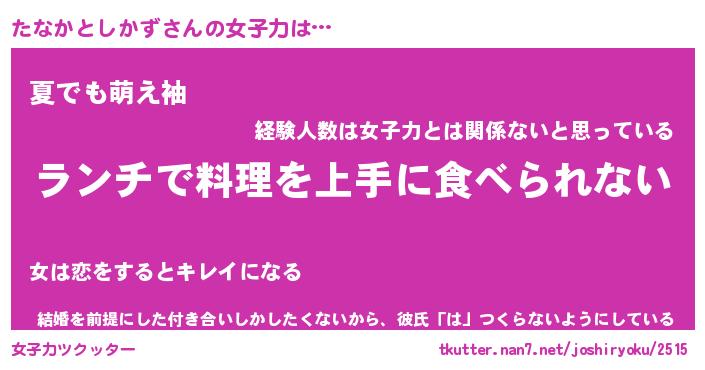 | ヘコむあだ名 | 『たなふぇ~』『なまこ酢』『たなを』 |