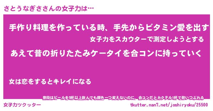 | 恥ずかしいあだ名 | 『プリティーさとうなぎさ』『さとっちょ』 |