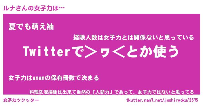 | ヘコむあだ名 | 『ルナもー』『なまこ酢』『ルナ(爆)』 |