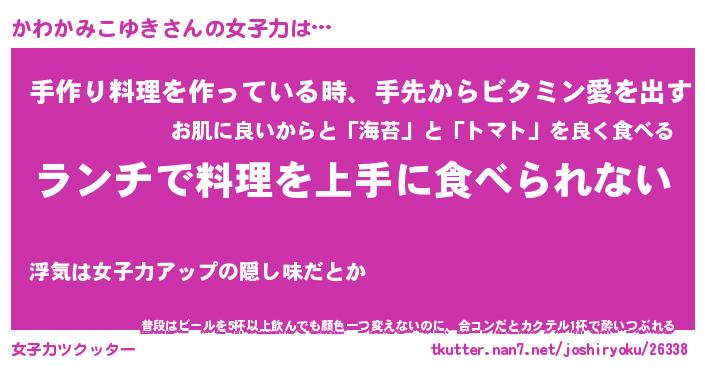 | 恥ずかしいあだ名 | 『プリティーかわかみこゆき』『かわちん』 |