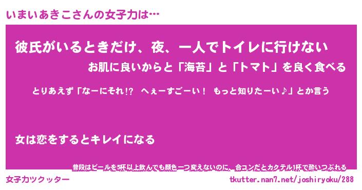 | 恥ずかしいあだ名 | 『プリティーいまいあきこ』『いまっちょ』 |