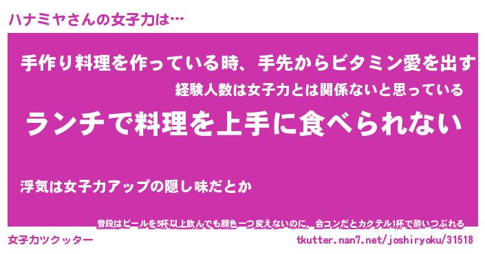 | ヘコむあだ名 | 『ハナふぇ~』『牛乳』『ハナっちょ』 |