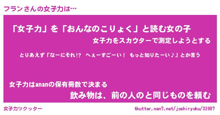 | 女子向けラノベタイトル風あだ名 | 『フラン姫と円卓の騎士』 |