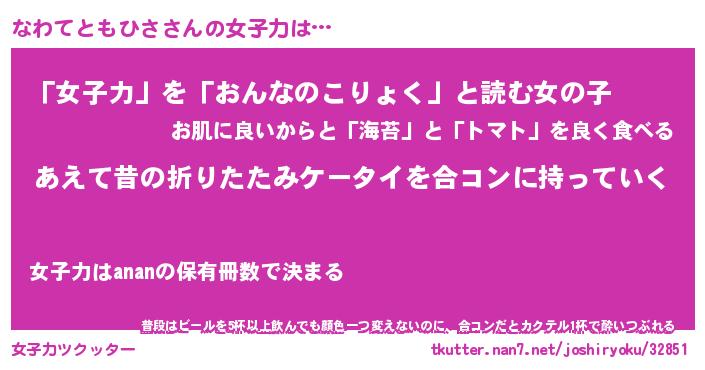 | 女子向けラノベタイトル風あだ名 | 『(仮)なわてともひさのやんごとなき事情』 |