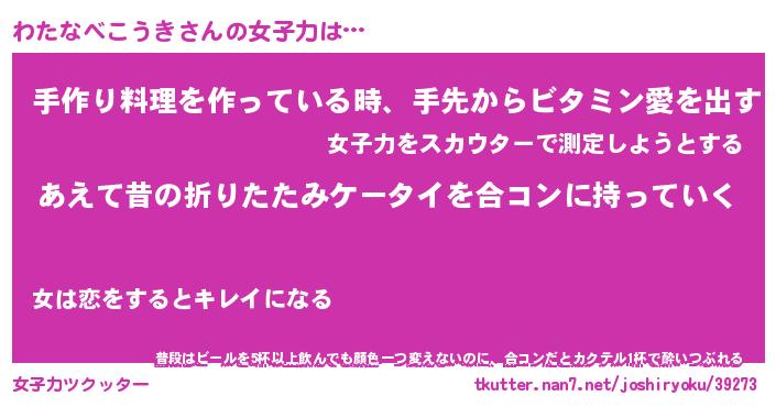 | ヘコむあだ名 | 『わたもー』『つくし』『わた太郎』 |