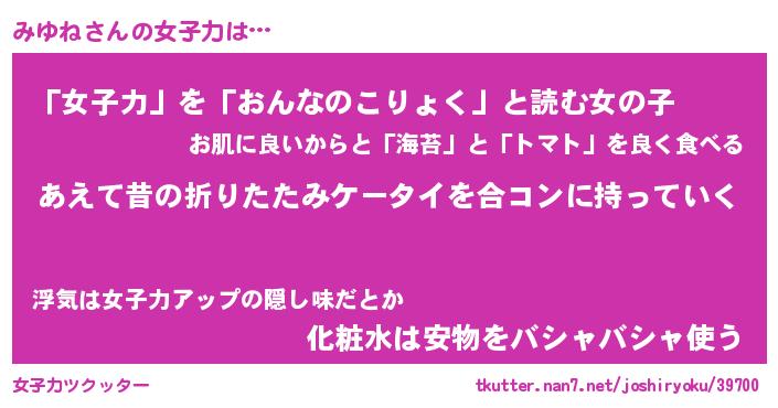 | ポケモン風あだ名 | 『ミユチュウ』『ミユネダネ』 |