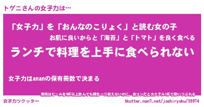 | ヘコむあだ名 | 『トゲふぇ~』『レバニラ』『トゲお』 |