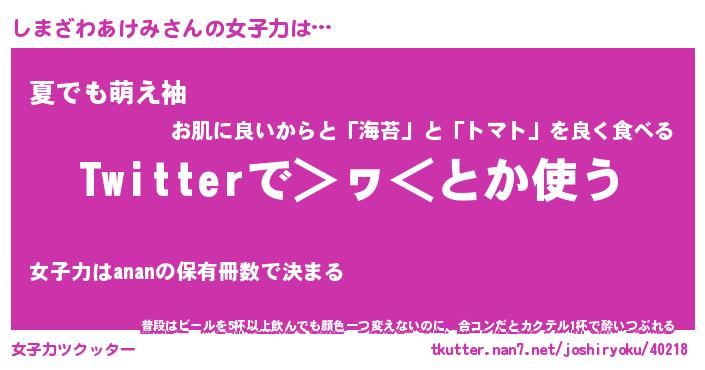 | 恥ずかしいあだ名 | 『プリティーしまざわあけみ』『しまちん』 |