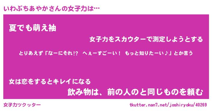 | 恥ずかしいあだ名 | 『プリティーいわぶちあやか』『いわちん』 |