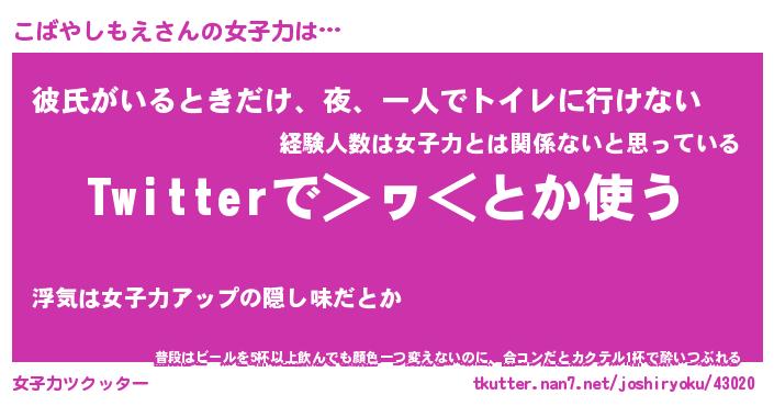 | ヘコむあだ名 | 『こばにゅー』『豆乳』『こばっぺ』 |