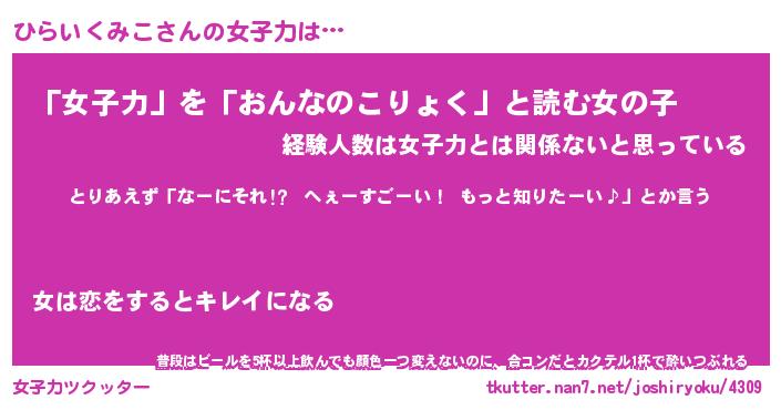 | 恥ずかしいあだ名 | 『プリティーひらいくみこ』『ひらっちょ』 |
