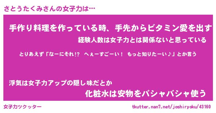 | 恥ずかしいあだ名 | 『プリティーさとうたくみ』『さとっちょ』 |