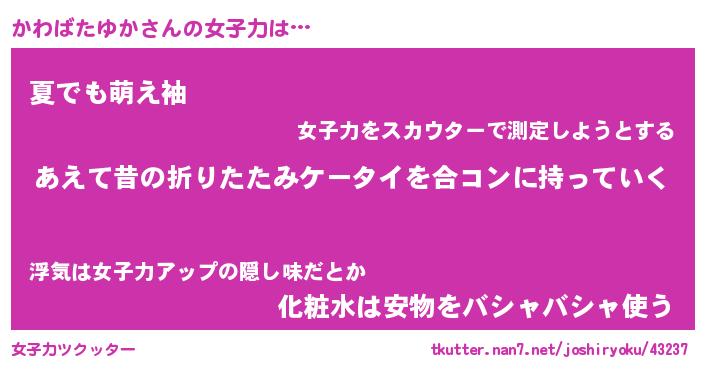 | 恥ずかしいあだ名 | 『プリティーかわばたゆか』『かわっちょ』 |