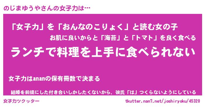 | 恥ずかしいあだ名 | 『プリティーのじまゆうや』『のじっちょ』 |