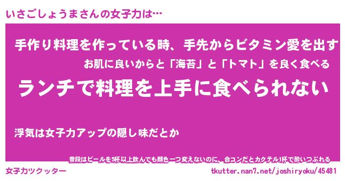 | 恥ずかしいあだ名 | 『プリティーいさごしょうま』『いさちん』 |