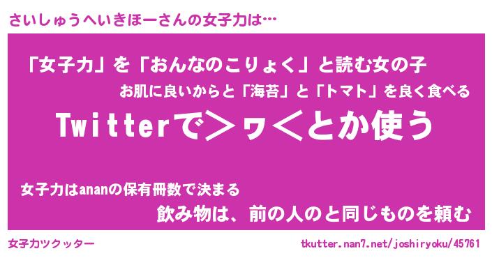 | 男性向けラノベタイトル風あだ名 | 『さいしゅうへいきほーの憂鬱』 |