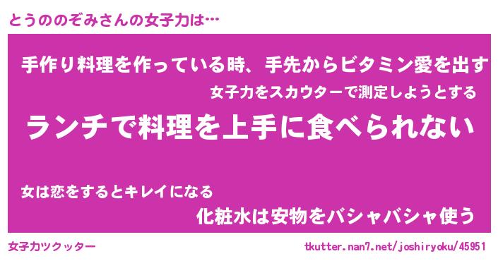 | ヒーロー風カッコイイあだ名 | 『スーパートウノノゾミ』『魔戒騎士トウ』 |