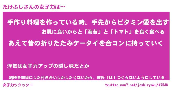 | ヘコむあだ名 | 『たけっふぃ~』『牛乳』『たけっ子』 |