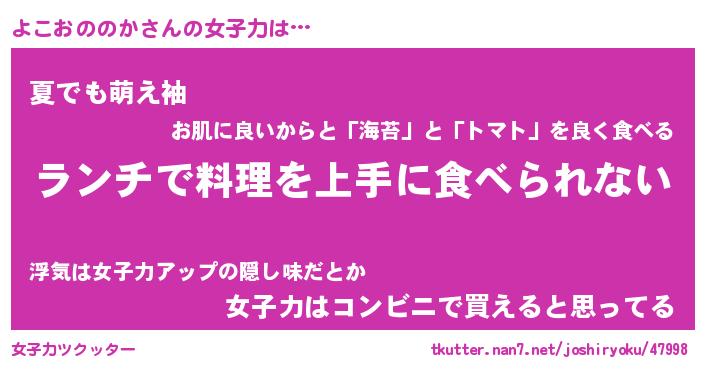 | 料理風あだ名 | 『ネギたっぷりよこおののかの南蛮漬け』 |