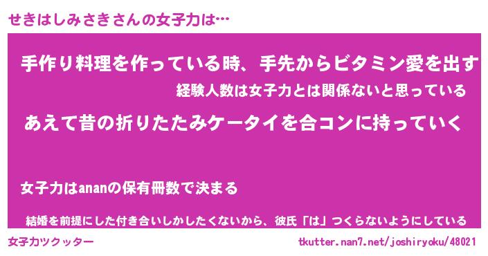| ヘコむあだ名 | 『せきふぇ~』『牛乳』『せきぷりん』 |