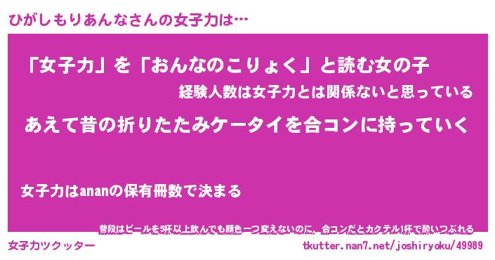 | 男性向けラノベタイトル風あだ名 | 『ひがしもりあんなの憂鬱』 |
