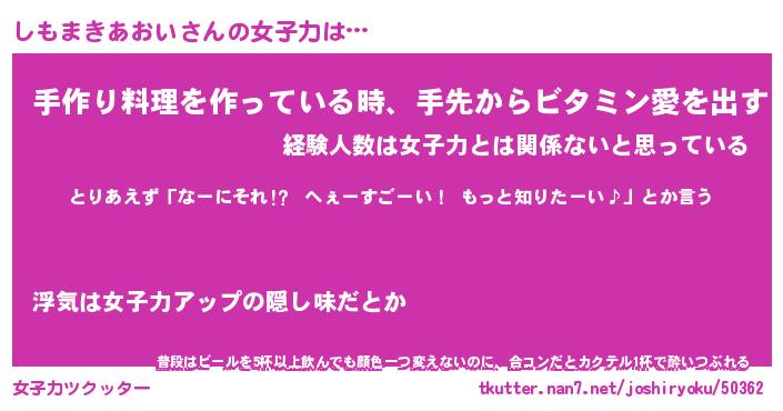 | 胡散臭い通販商品みたいなあだ名 | 『億万長者になれるブレスレット…その名も「しもまきあおい」』 |
