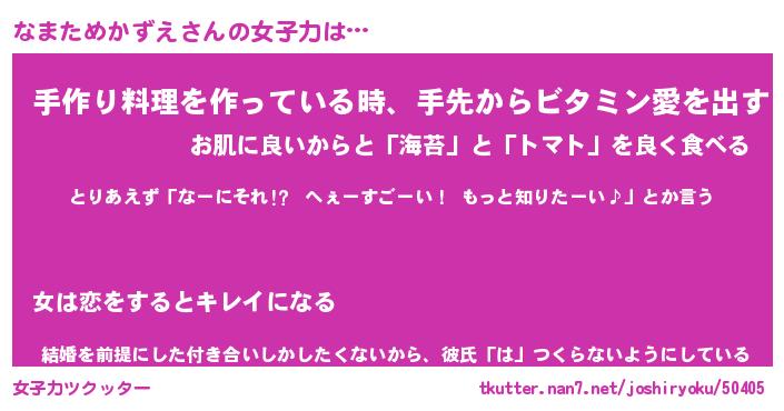 | 恥ずかしいあだ名 | 『プリティーなまためかずえ』『なまちん』 |