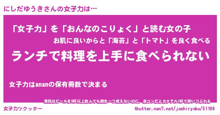 | ヘコむあだ名 | 『にしにー』『酢こんぶ』 |