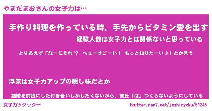 | 恥ずかしいあだ名 | 『プリティーやまだまお』『やまっちょ』 |