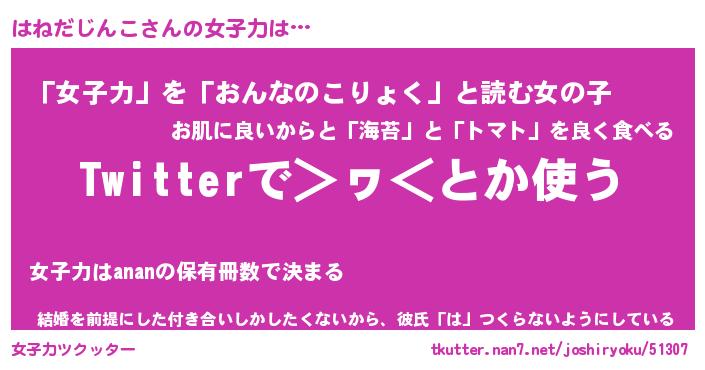 | 男性向けラノベタイトル風あだ名 | 『はねだじんこの憂鬱』 |