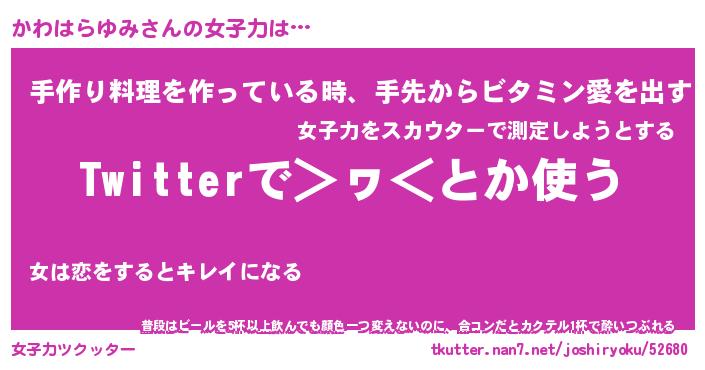 | 恥ずかしいあだ名 | 『プリティーかわはらゆみ』『かわっちょ』 |