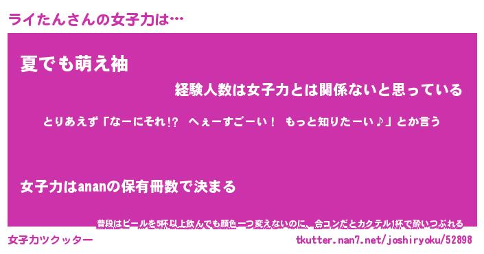 | ヘコむあだ名 | 『ライふぇ~』『酢こんぶ』『ライお』 |
