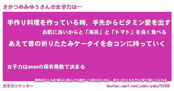| 恥ずかしいあだ名 | 『プリティーさかつめみゆう』『さかちん』 |