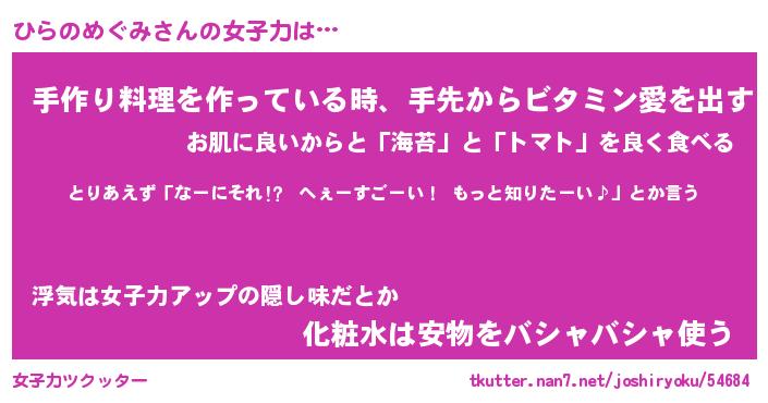 | 恥ずかしいあだ名 | 『プリティーひらのめぐみ』『ひらっちょ』 |