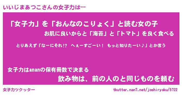 | 女子向けラノベタイトル風あだ名 | 『いいじまあつこ姫と円卓の騎士』 |
