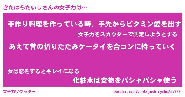 | ヘコむあだ名 | 『きたふぇ~』『つくし』『きた太郎』 |