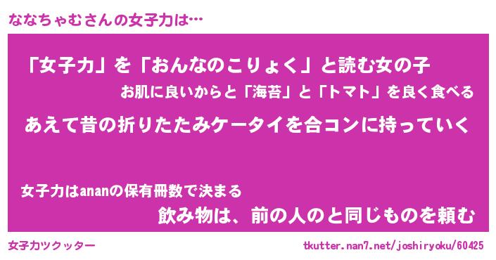| ヘコむあだ名 | 『ななにー』『なまこ酢』『ななっぺ』 |
