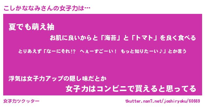 | 肩書あだ名 | 『こしかななみCEO』『こしかななみ班長』 |