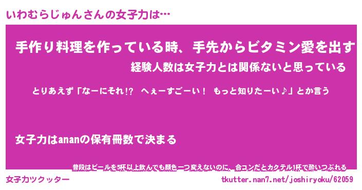 | ヘコむあだ名 | 『いわにー』『なまこ酢』『いわ太郎』 |