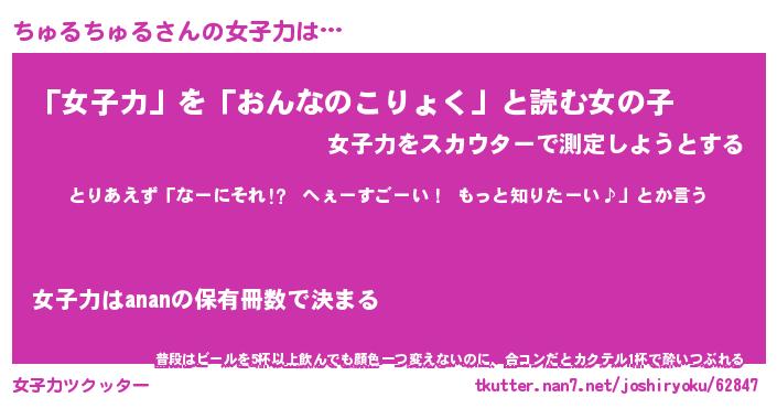 | ヘコむあだ名 | 『ちゅにー』『つくし』『ちゅぷりん』 |