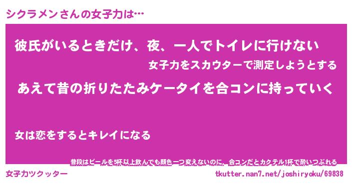 | ファンタジー風あだ名 | 『シクフェル』『エターナルシクラメンー』 |