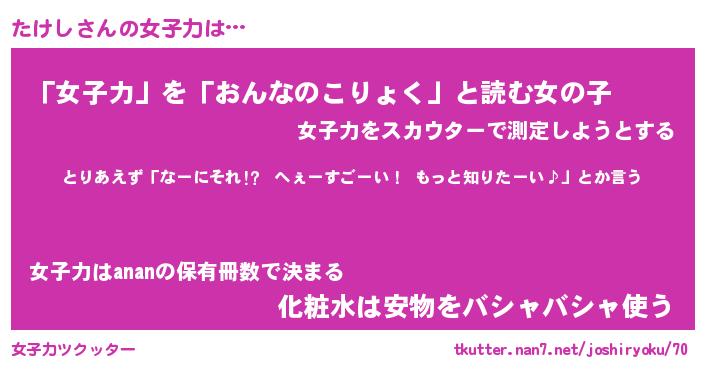 | ヘコむあだ名 | 『たけっふぃ~』『つくし』 |
